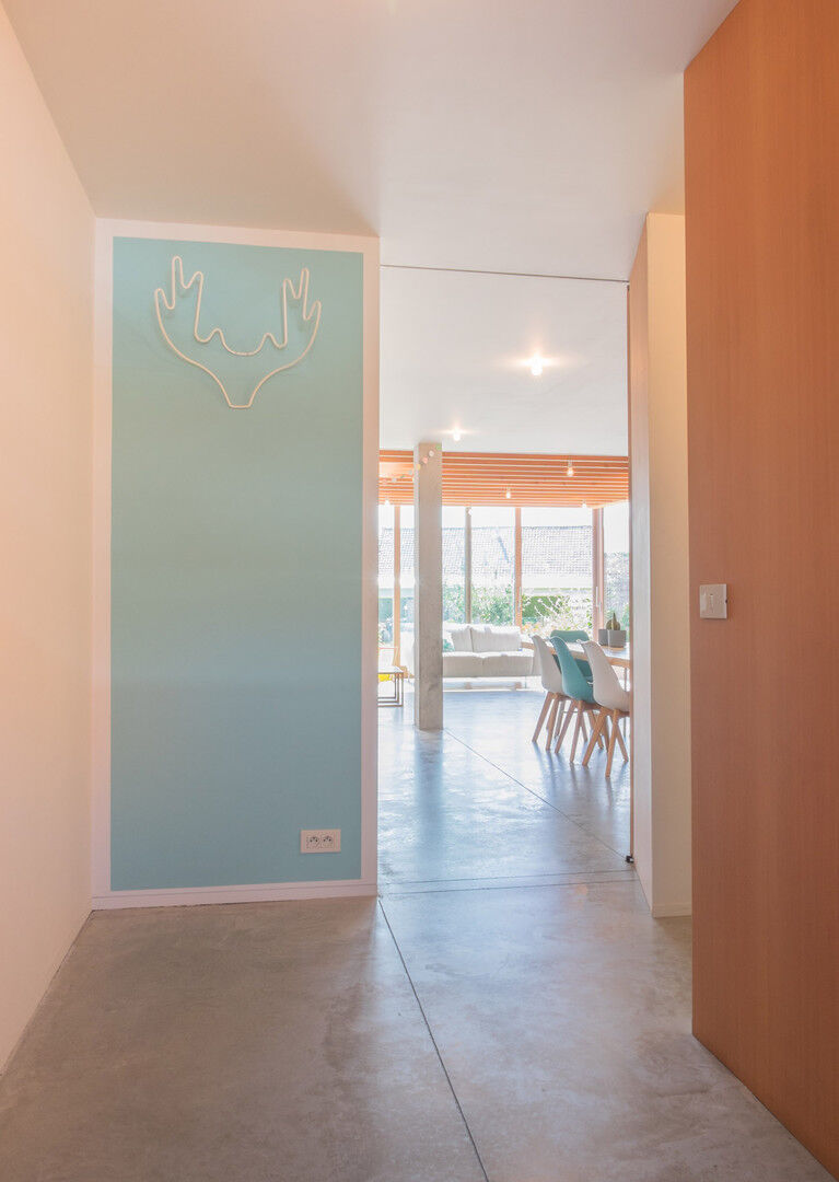 Verbouwing woning in Ruddervoorde. Woonuitbreiding met veel glas en zichtbare houten roostering.